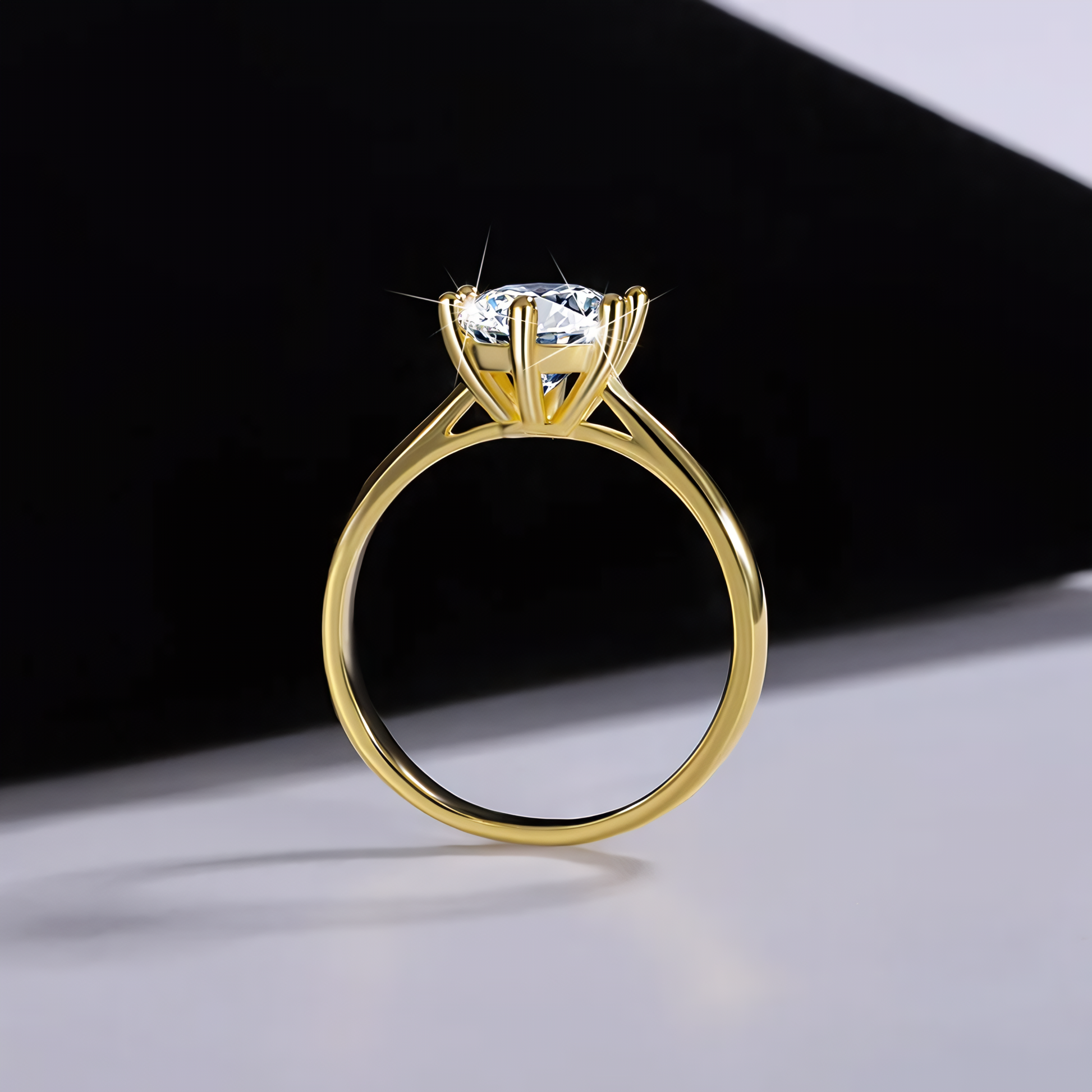 In a clean, classic six-prong setting, the brilliant Moissanite is lifted high, allowing it to catch and refract light from every angle for an unmatched, fiery glow. Its simple, elegant silhouette lets the stunning clarity stone take center stage.